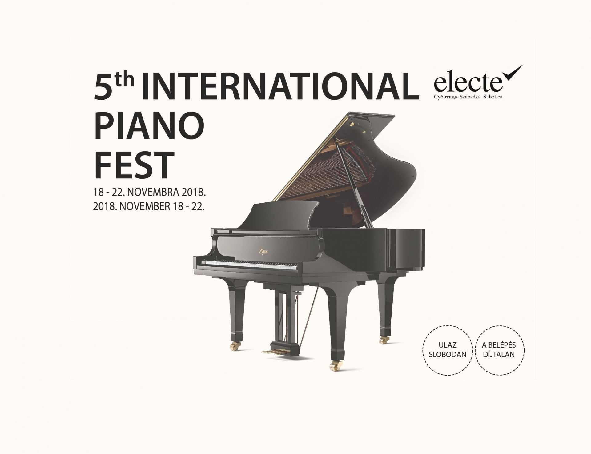 Prvi deo 5. International Piano Festa biće održan od 18. do 22. novembra 2018. godine, dok će drugi deo festivala biti održan od 21. do 26. januara 2019. godine. Predstojeći festival donosi pred subotičku publiku deset odličnih koncerata klavirske muzike.