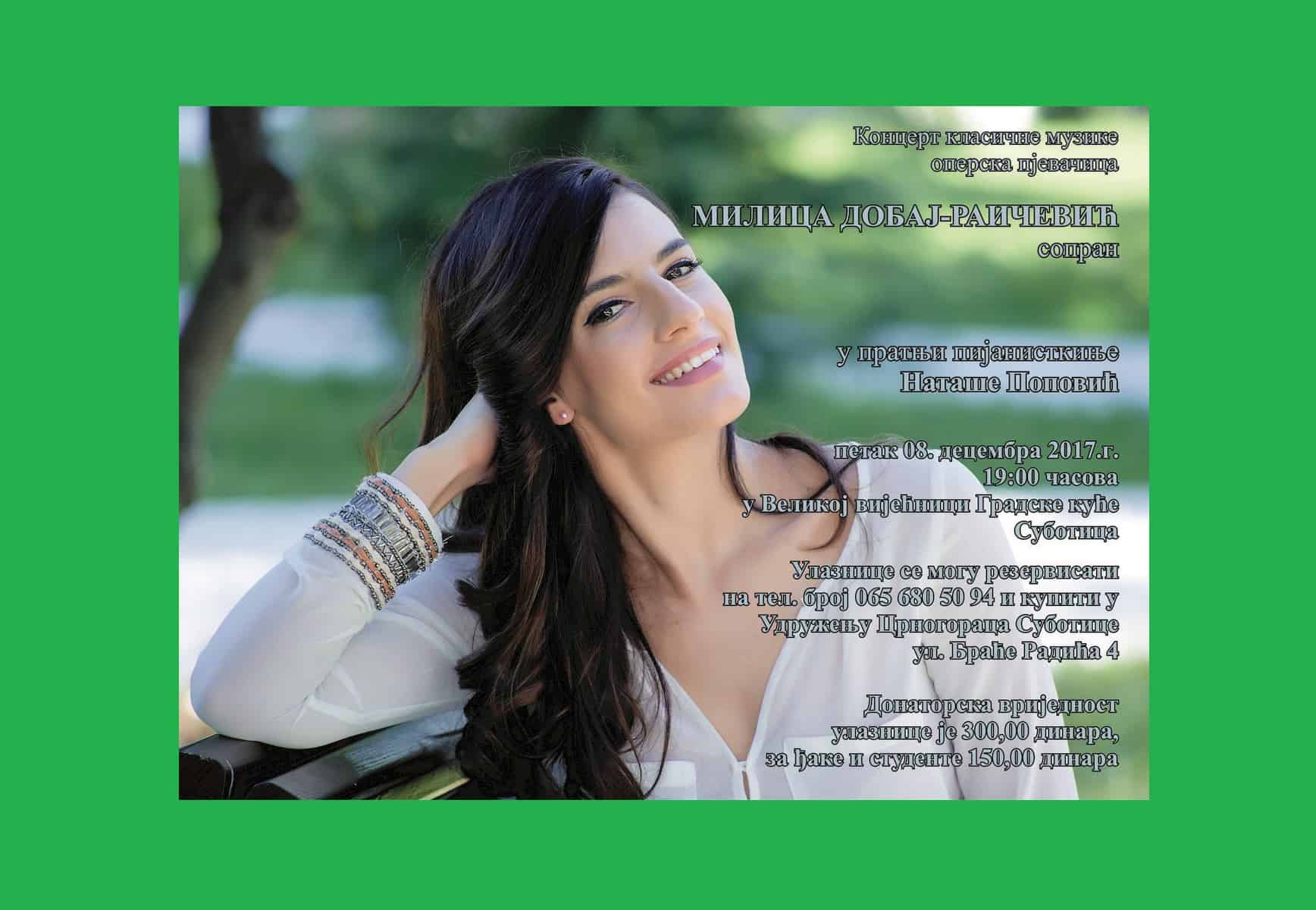 Koncert za sopran i klavir Milice Dobaj Raičević i Nataše Popović biće održan u petak, 8. decembra 2017. godine. Udruženje Crnogoraca Subotica u Velikoj većnici Gradske kuće ugostiće mlade umetnice iz Crne Gore, a početak koncerta je zakazan za 19 časova.